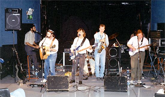 April 10th, 1994 - "Savannah Blue" release party at the Ellicott Theatre. l-r Eugene, David, RW, Randy not shown), Joe, John Dayton, Bill. (photo: Bob Miller)