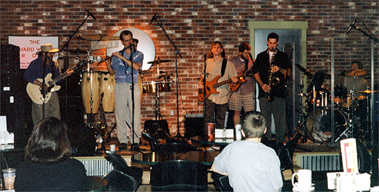 Full group at Jammin' Java's in Vienna, April 2001. l-r David, Joe, Mitchell, RW, Andrew, Jacob, Eric. (photo: Kathi Robertson)